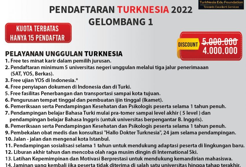 TurkNesia Edu Foundation merupakan konsultasi pendidikan kuliah di Turki dengan penawaran lengkap dari penyiapan dokumen di Indonesia hingga pendampingan di Turki dalam waktu 1 tahun penuh. TurkNesia berdiri sejak 2017 dan telah membantu proses penempatan siswa ke Perguruan Tinggi Negeri terbaik Turki terletak di lebih dari 14 kota. Dengan pelayanan […]